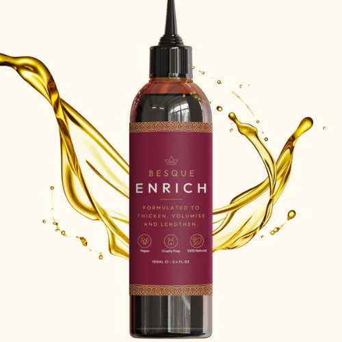 It’s officially the season of pomegranates, and this fruit is packed with benefits for hair growth. Pomegranate increases scalp blood flow and strengthens hair follicles by producing punicic acid. This fruit also has antioxidant properties. But we can’t just take a pomegranate and apply it directly to our hair for better growth. Here comes Besque Enrich Hair Growth Oil. This oil is made with pomegranate and black seed oil, which is best for supporting hair growth.